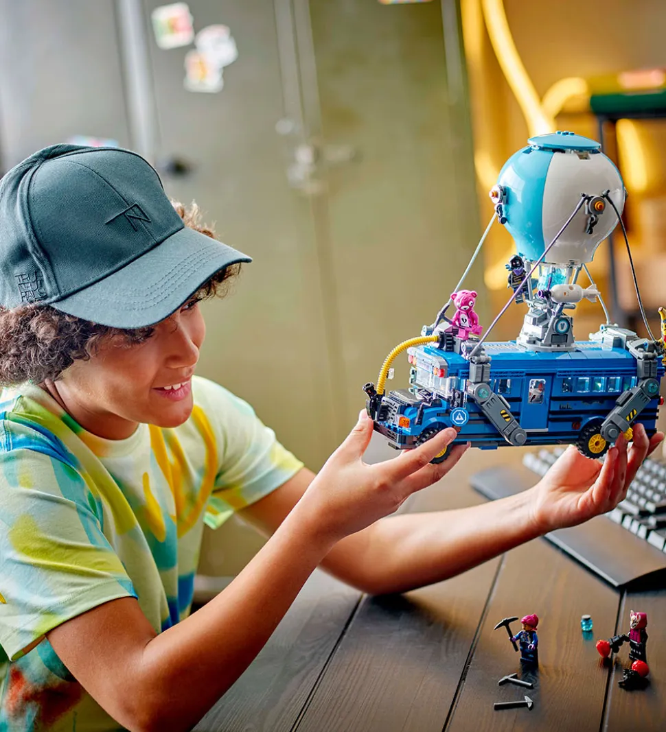 Sejt LEGO® Fortnite sæt med i alt 954 klodser, som kan samles til Battle Bus fra det populære onlinespil.