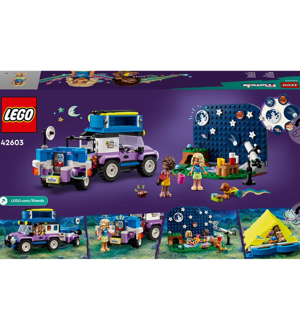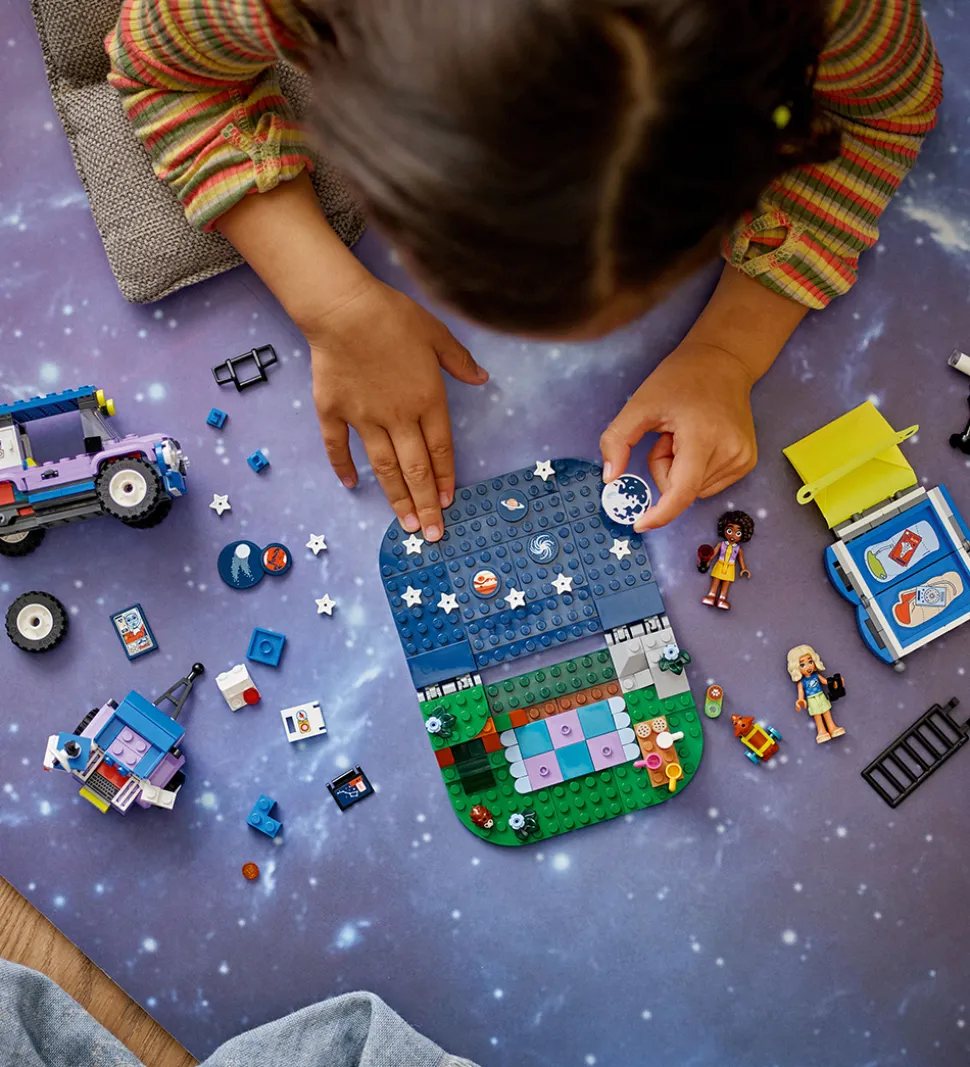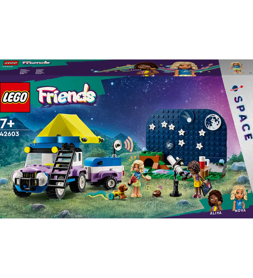LEGO® Friends sættet er det perfekte legetøj til det kreative barn, der vil bygge og lege med sættet, som indeholder et landskabsscene med stjernehimmel, et teleskop, der kan bygges, en firhjulstrækker med campingtrailer og sammenklappeligt telt, to minidukker af Aliya og Nova, en hundefigur og en pindsvinefigur samt tilbehør i form af krus, småkager, en kikkert, en lommelygte, ekstra stjerner og print af forskellige planete.