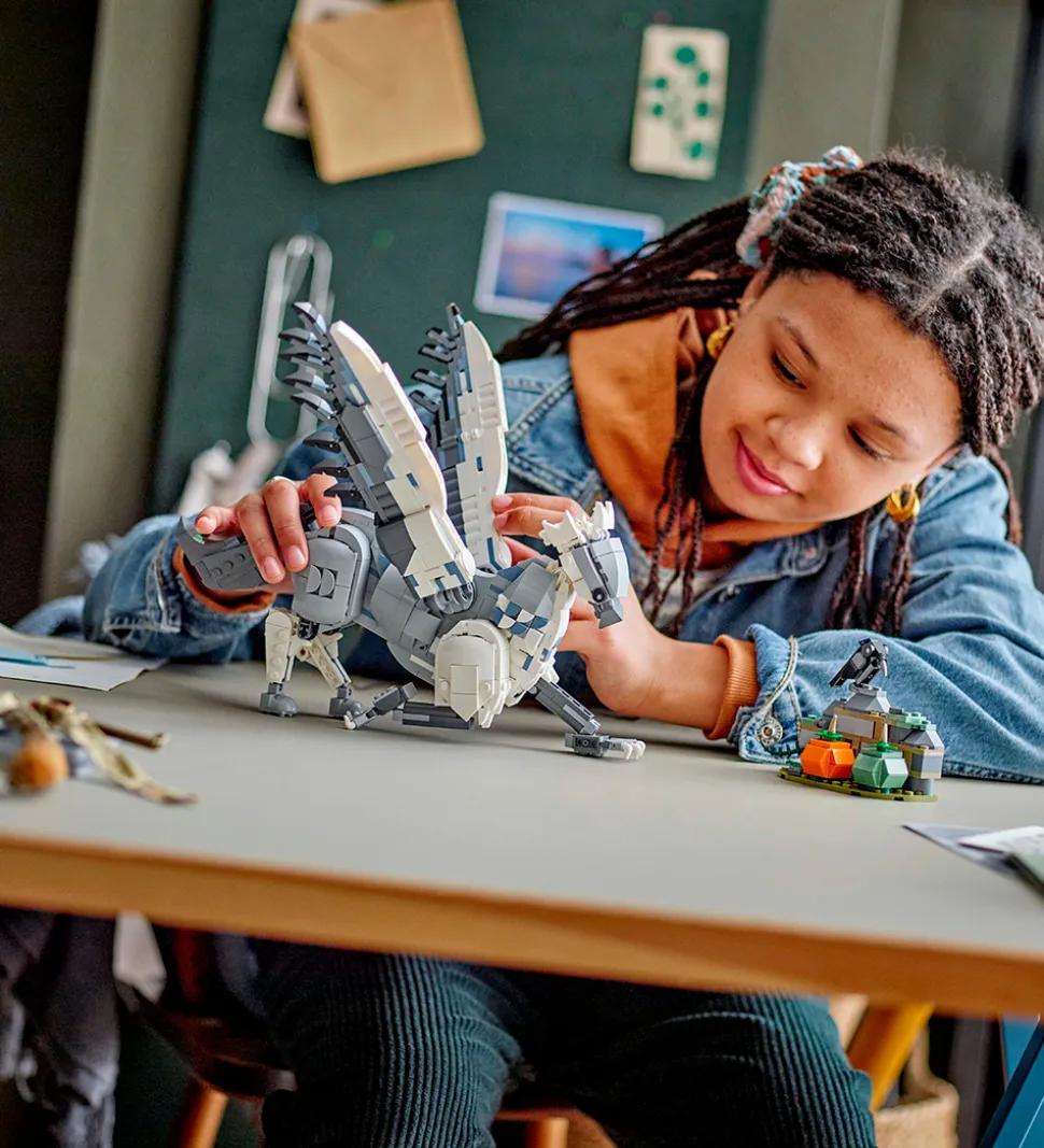 LEGO® Harry Potter sættet er det perfekte legetøj til det kreative barn, som vil bygge og lege med sættet, der indeholder en bevægelig model af hippogriffen Stormvind og en lille del af Hagrids have med en mur og 2 græskar, der kan bygges, samt en fuglefigur.