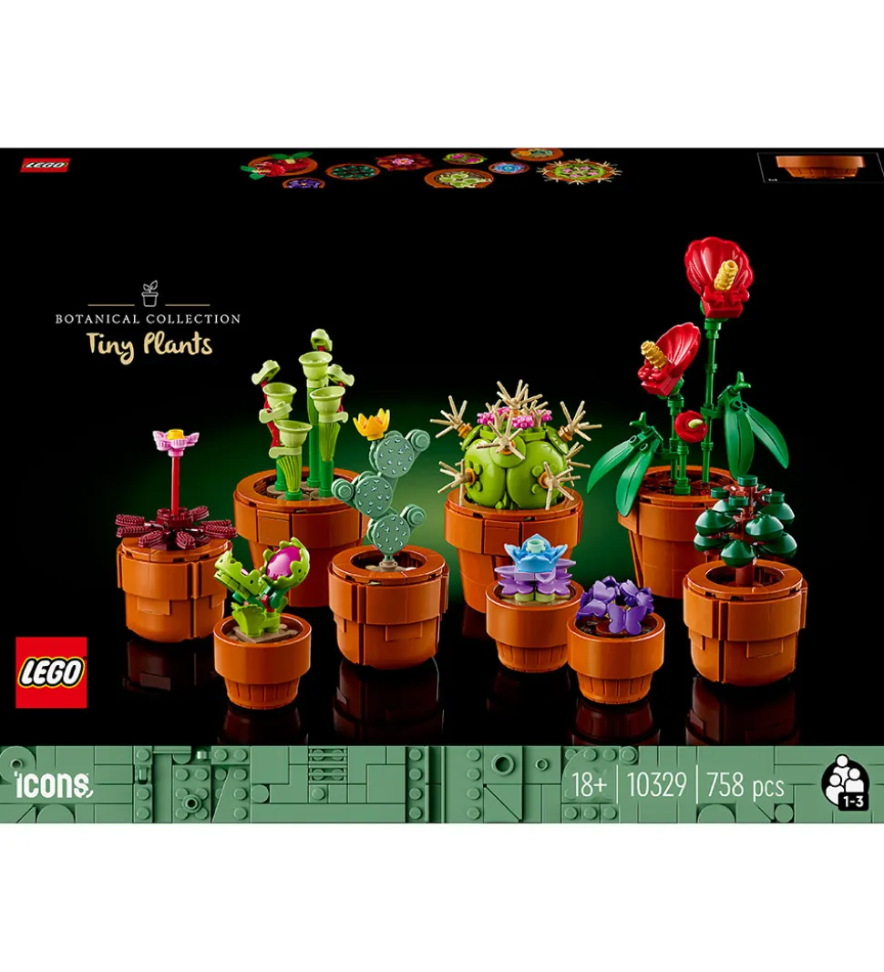 Smart LEGO® Icons sæt med i alt 758 klodser, som kan samles til ni forskellige små planter i brune krukker. Planterne er modeller af arter, der gror på tørre steder, samt tropiske og kødædende arter.