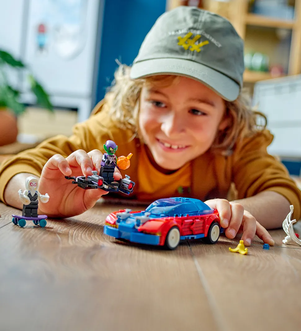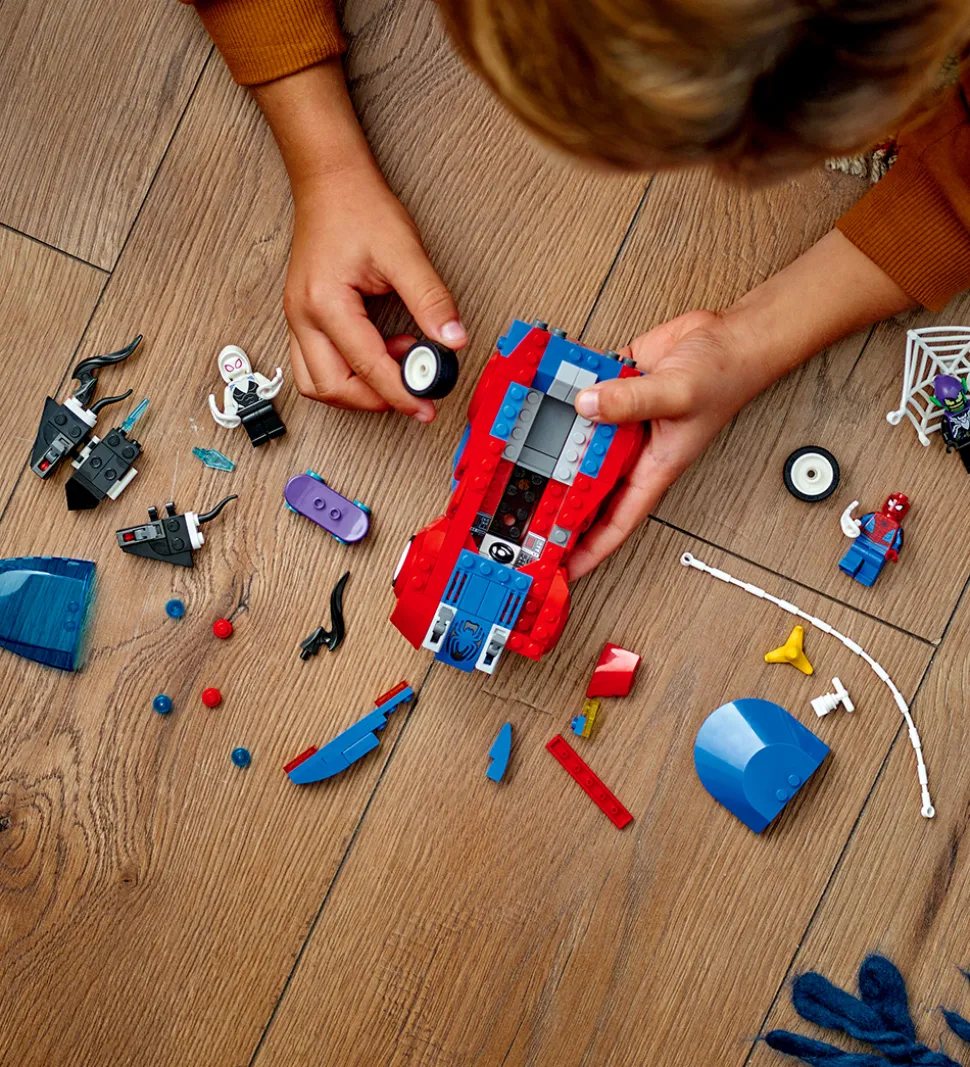 LEGO® Marvel Spider-Man sættet er det perfekte legetøj til det kreative barn, der vil bygge og lege med sættet, som indeholder en Spider-Man-bil, som børn kan bygge, våben, tilbehør, minifigurer af Marvel-heltene Spider-Man og Ghost-Spider samt en minifigur af Venom Green Goblin.