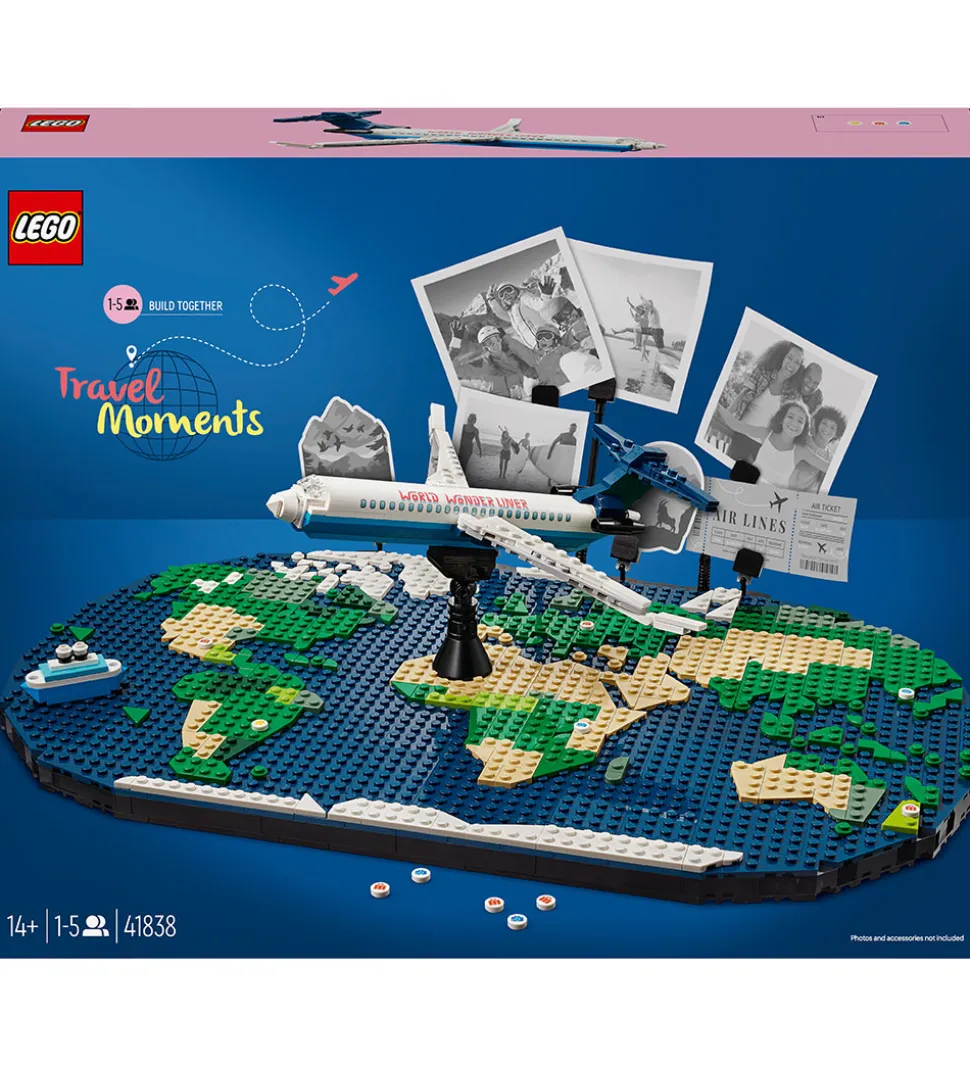 Hyggeligt LEGO® sæt med titlen “Rejseminder”, der har i alt 1231 klodser, som kan samles til modeller af et verdenskort, et jetfly, 4 mikromodeller af fartøjer, 20 markeringsmosaikker og 10 fotoholdere.