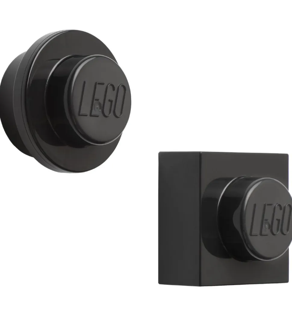 Fine LEGO® Storage magneter i sort i en rund og firkantet form med en knop på toppen.