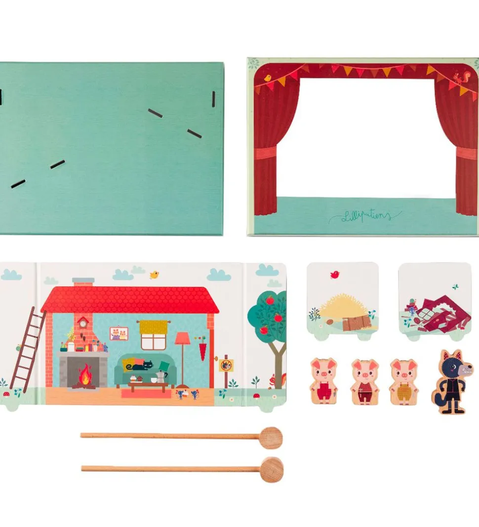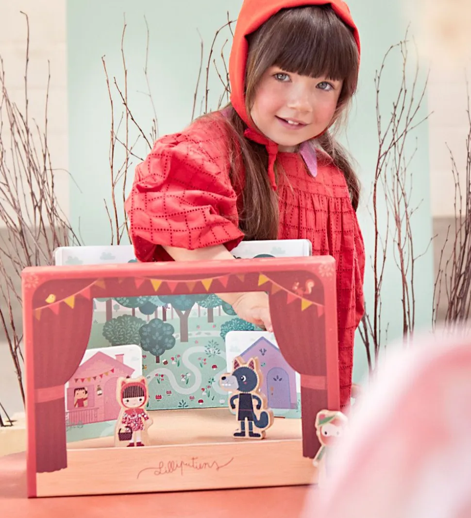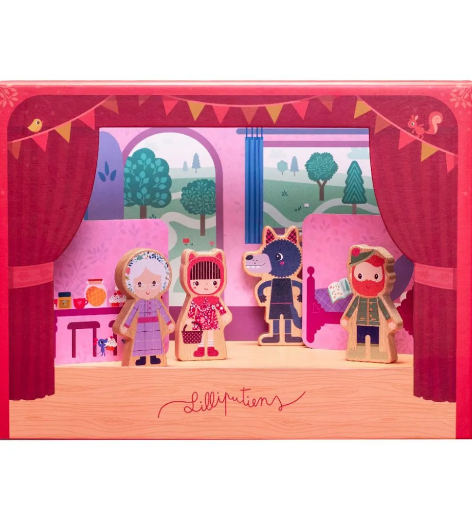 Lilliputiens aktivitetslegetøjet er en sjov stilsiddende aktivitet. Med dette sæt, kan man være med til at omskrive eller skrive sit eget eventyr og Rødhætte og ulven. Det hele kan samles, så det ligner at der bliver opført et teaterstykke. Med de to pinde med magneter kan de fire figurer styres bagfra scenen, da de alle har magneter under fødderne.