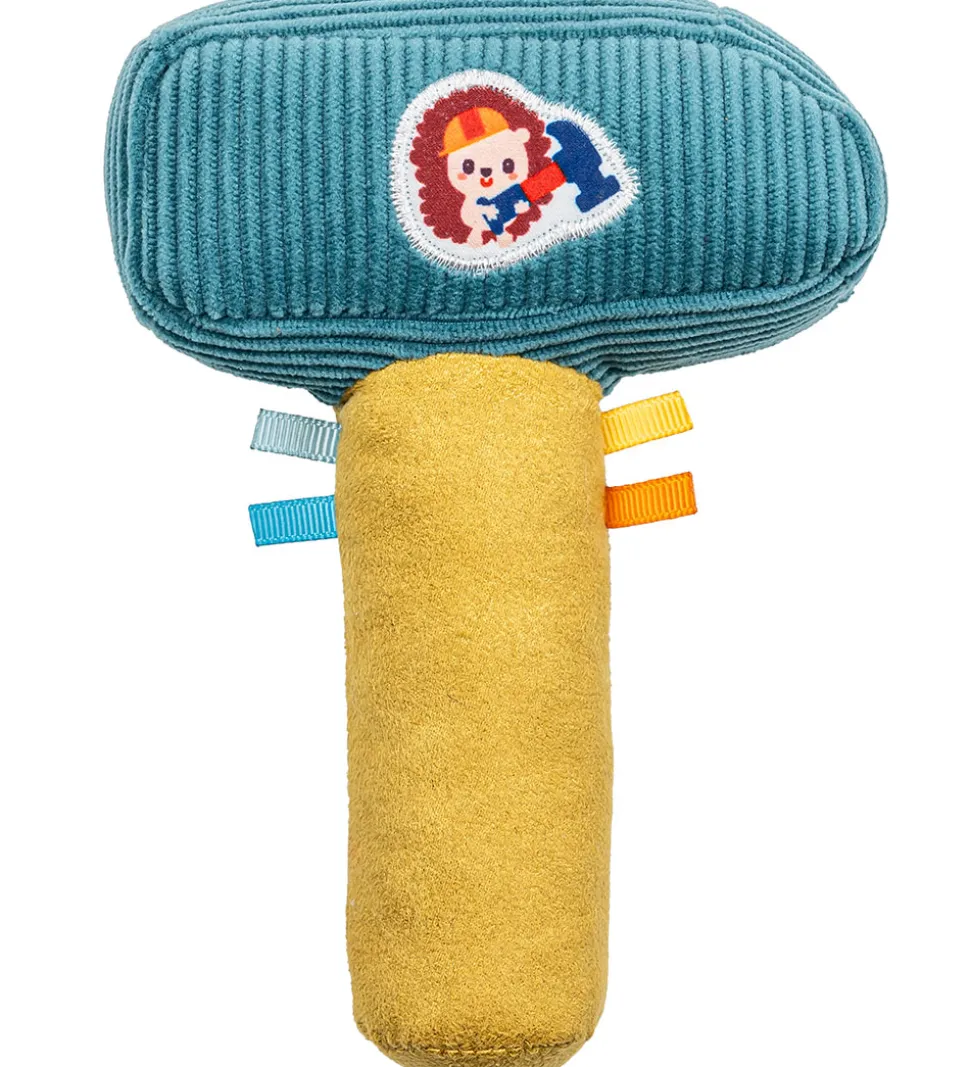 Charmerende Lilliputiens rangle med form som en hammer. Lilliputiens ranglen har forskellige farver og overflader som gør det sjovt for det lille barn at røre ved. Derudover har ranglen en sjov lydeffekt, når den bliver svunget fra side til side.