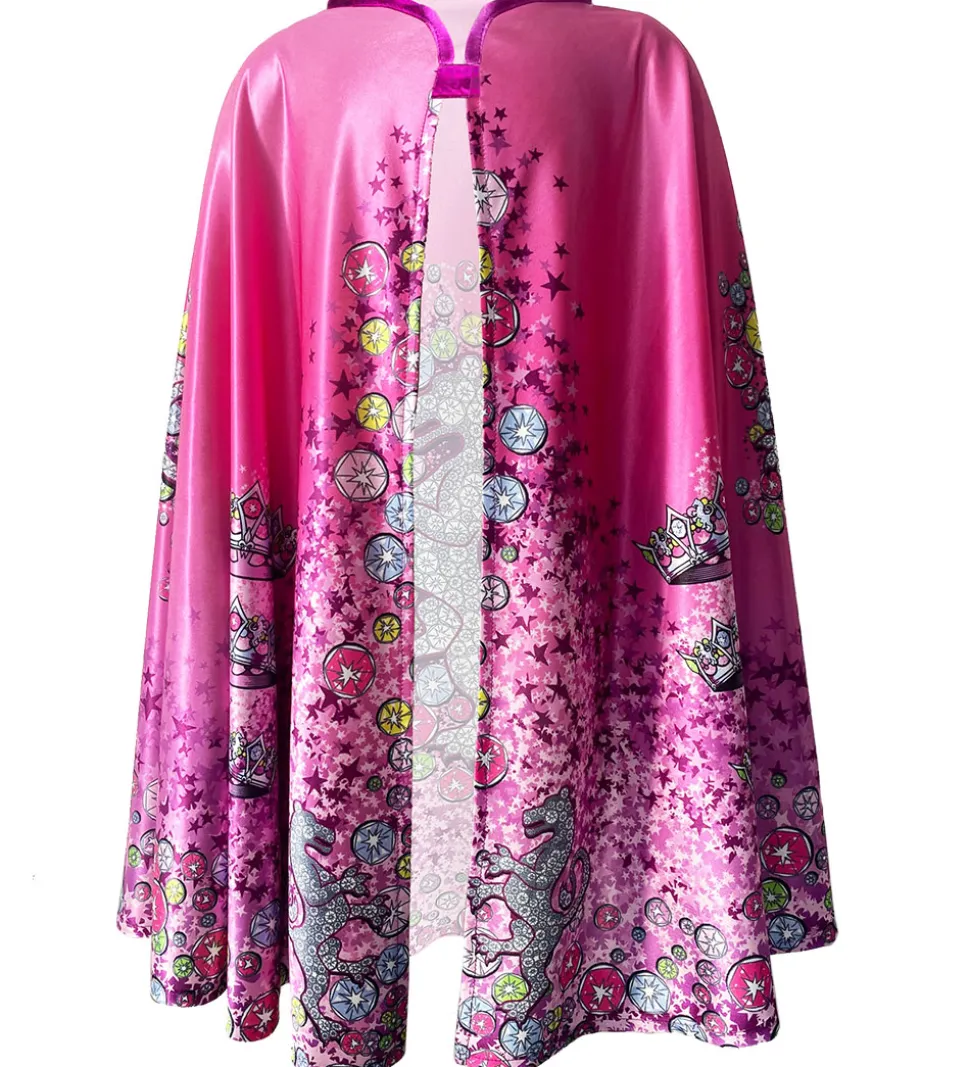 Flot Liontouch prinsessekappe i skinnende pink med et hesteprint bagpå og mange farverige detaljer. Prinsessekappen lukkes fortil med en velcrolukning.