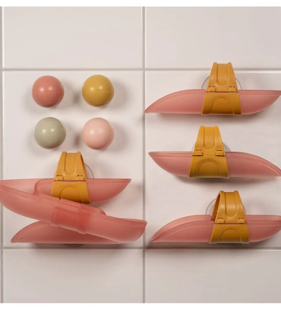 Little Dutch bådene hænges op med sugekopper på badeværelsesfliserne i forskudt af hinanden, så de tilsammen danner en kuglebane, som de små kan lege med, imens de er i bad.