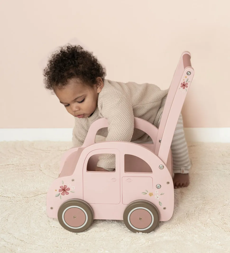 Sød Little Dutch gåvogn i træ med form som en bil i lyserød med blomsterprint.