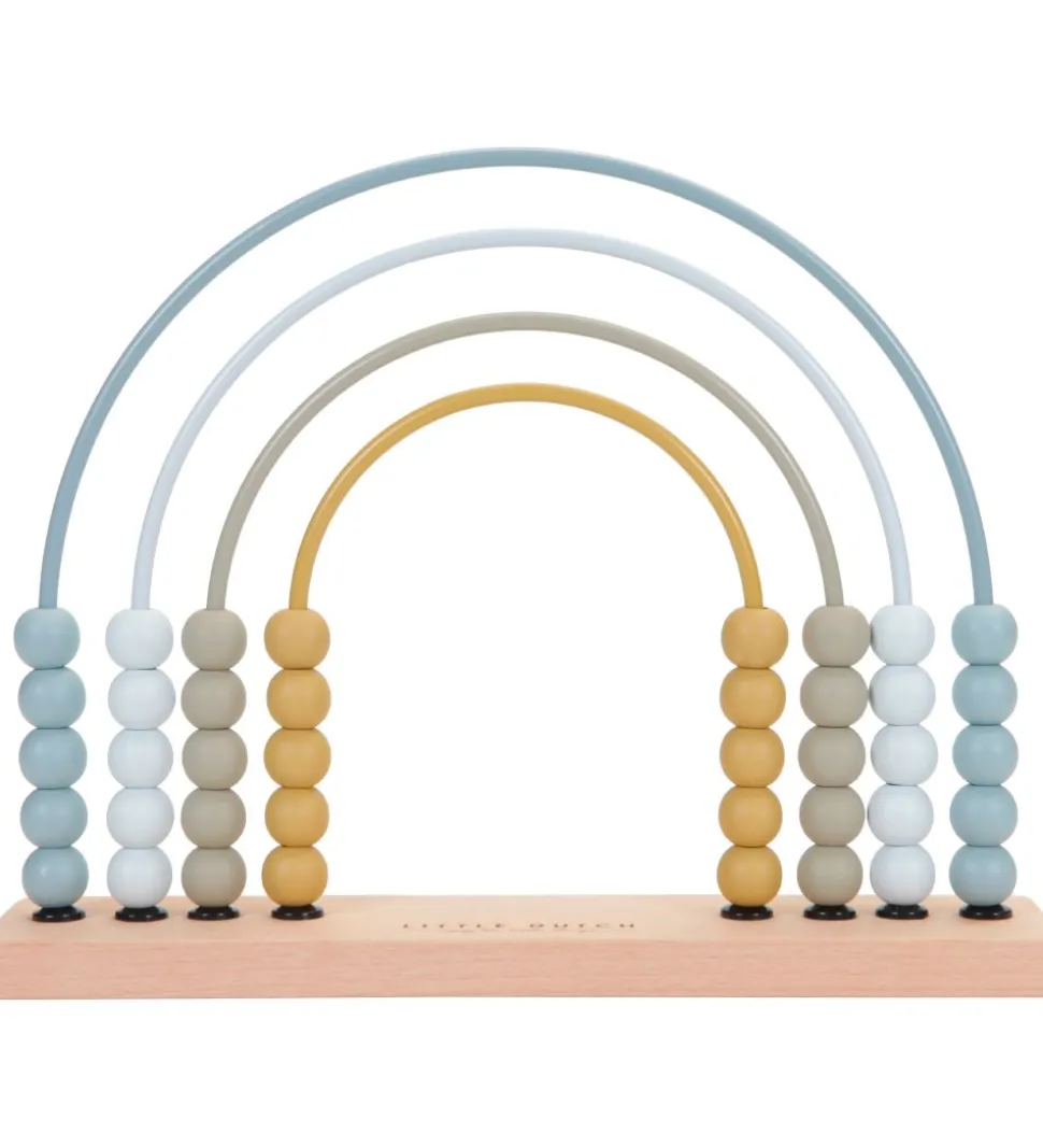 Sød Little Dutch kugleramme med form som en regnbue med trækugler i blå, lyseblå, grå og karrygul samt buer i samme farver som kuglerne.