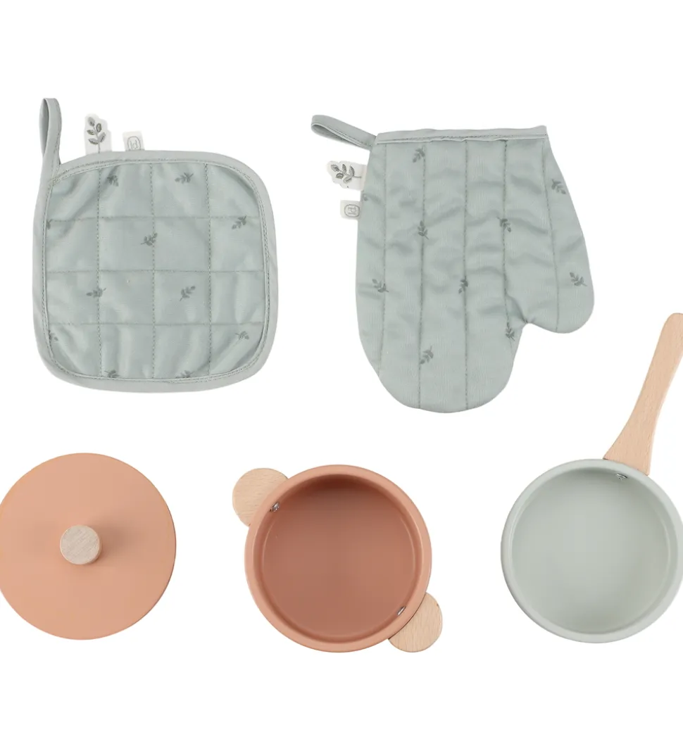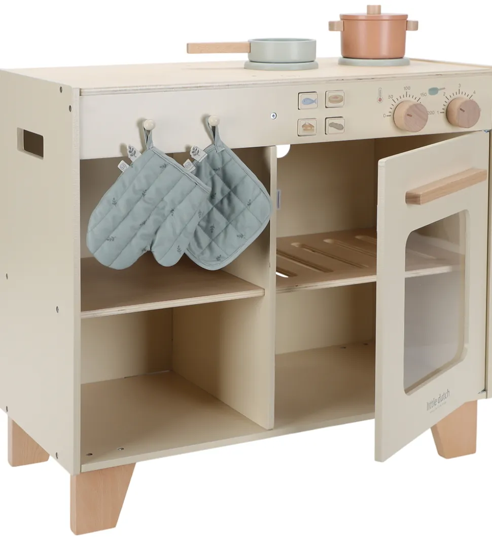 Little Dutch legekøkkenet består af en bordplade med to kogeplader og en ovn med låge, der kan åbnes, samt to hylder på den anden side. Derudover medfølger to gryder og en grydelap, og køkkenet er udstyret med trykknapper med illustrationer, som gør legen mere realistisk.