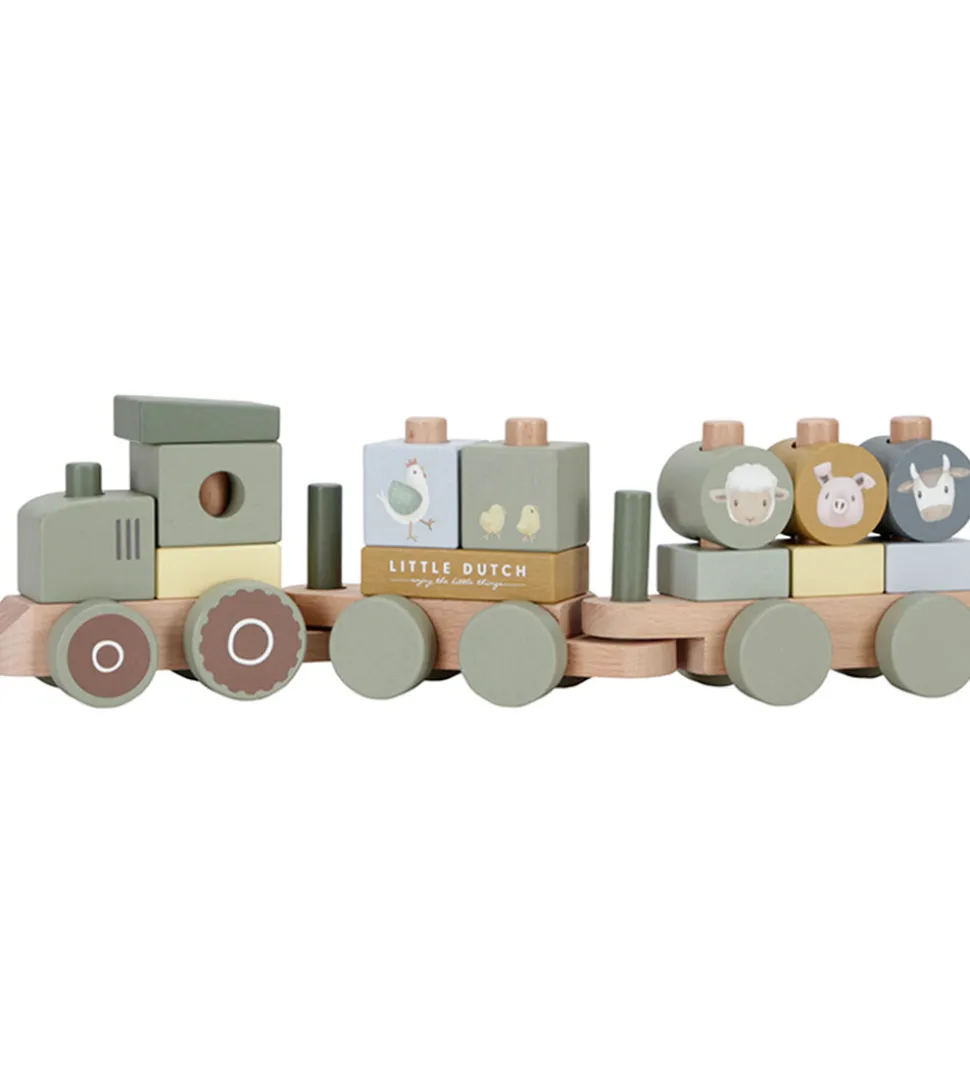 Little Dutch stabletoget består af en traktor og to vogne med små pinde. Til toget kommer klodser i forskellige former og farver. Klodserne har hul i midten, så de kan stables på pælene. Toget har små hjul og en lang snor, så barnet kan trække det efter sig.