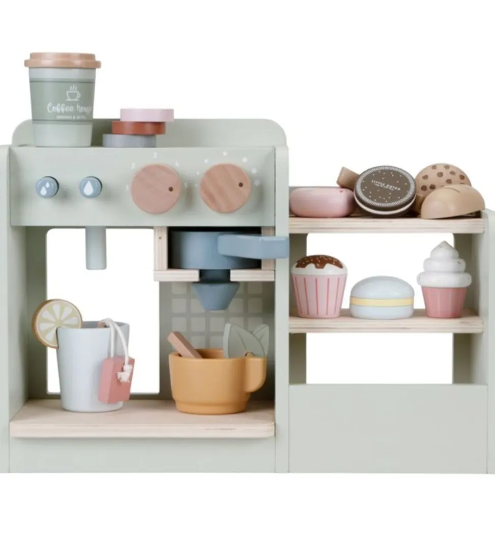 Sjovt Little Dutch trælegetøj i fine farver, som er formet som et cafe-sæt med følgende ting: