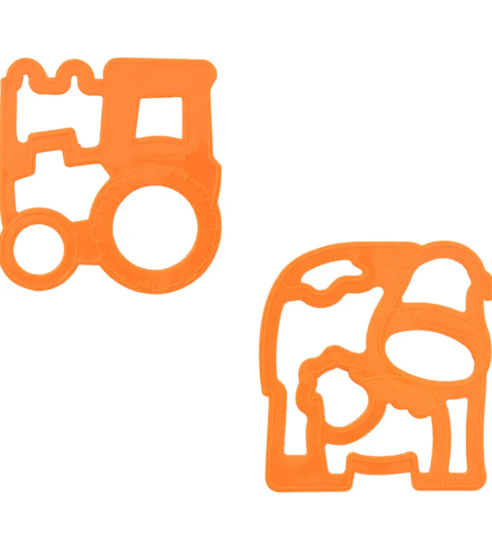 Sjove Lunch Punch udstikkere i orange og solgt som en 2-pak med form som en traktor og en ko med kalv.