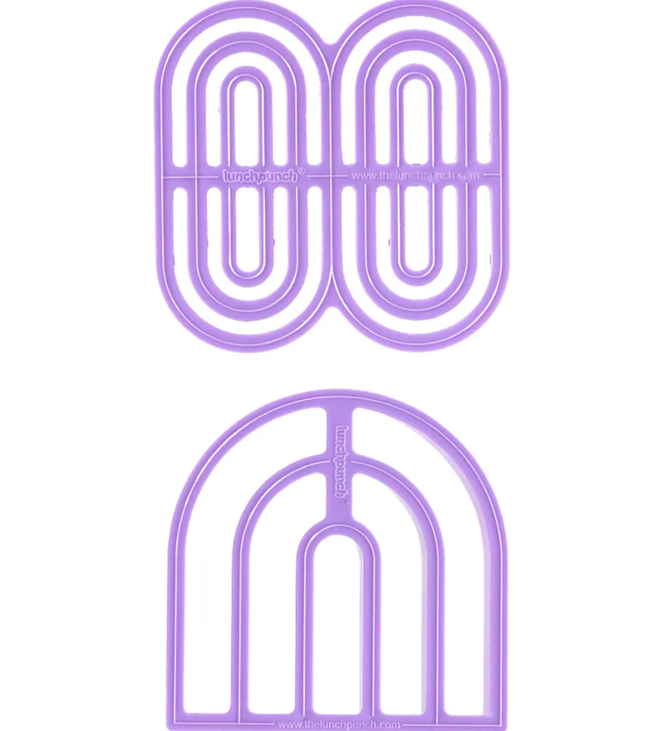 Sjove Lunch Punch udstikkere i lilla med form som regnbuer og solgt som en 2-pak.