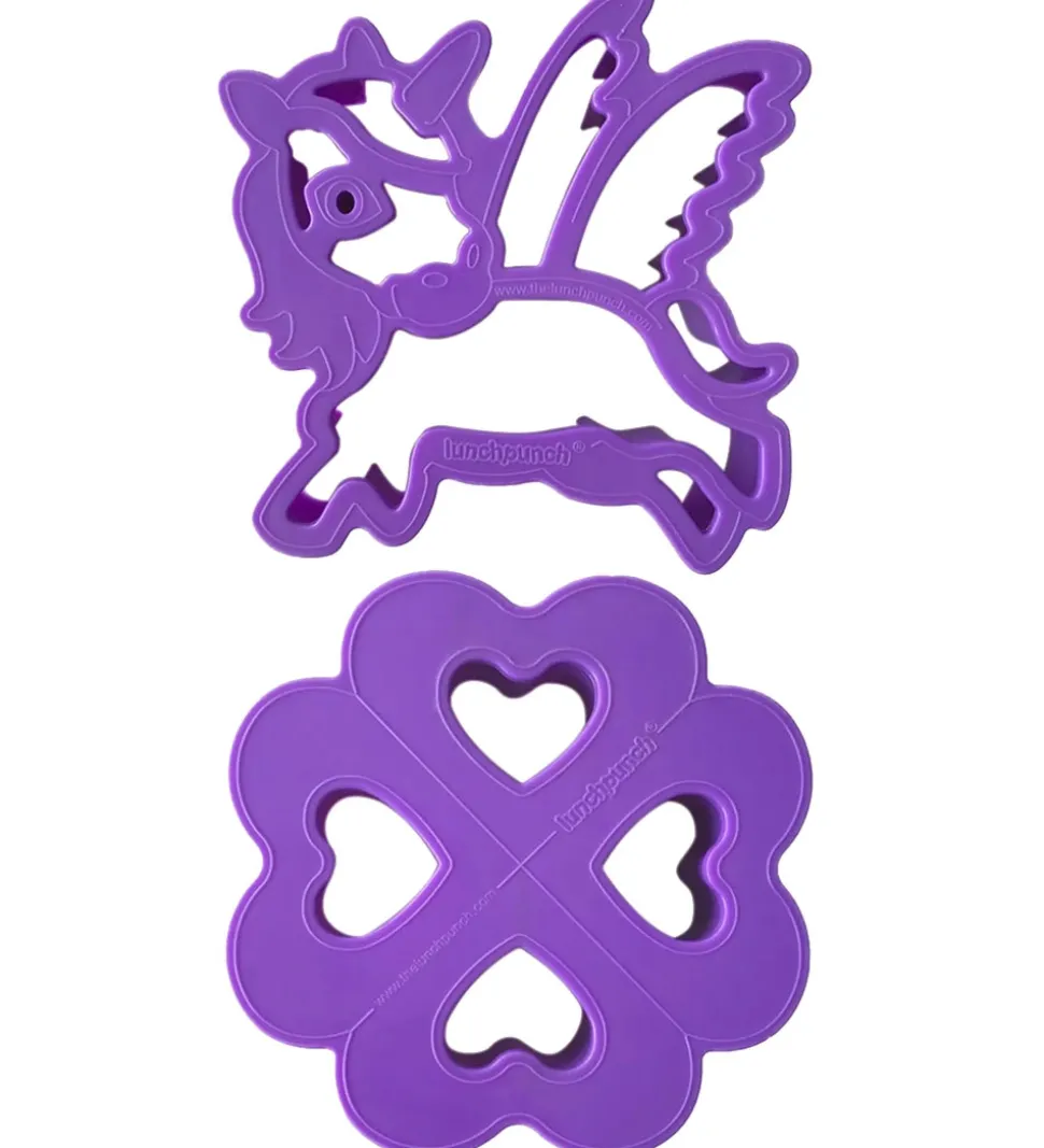 Sjove Lunch Punch udstikkere i mørk lilla og solgt som en 2-pak med form som en enhjørning og hjerter.