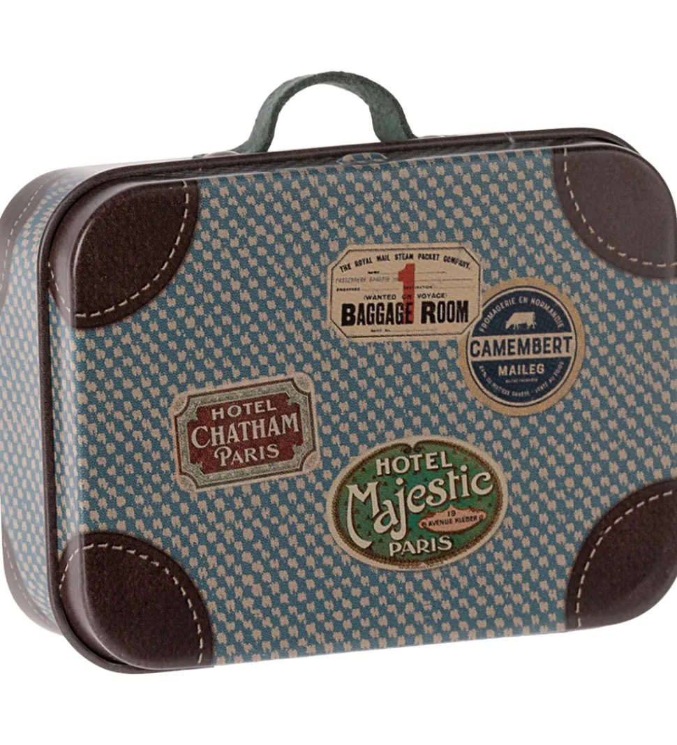 Fin Maileg kuffert i blå med beige prikker og brune hjørner, samt et print af vintage klistermærker. Kuffertens håndtag er fremstillet af imiteret ruskind i blå.
