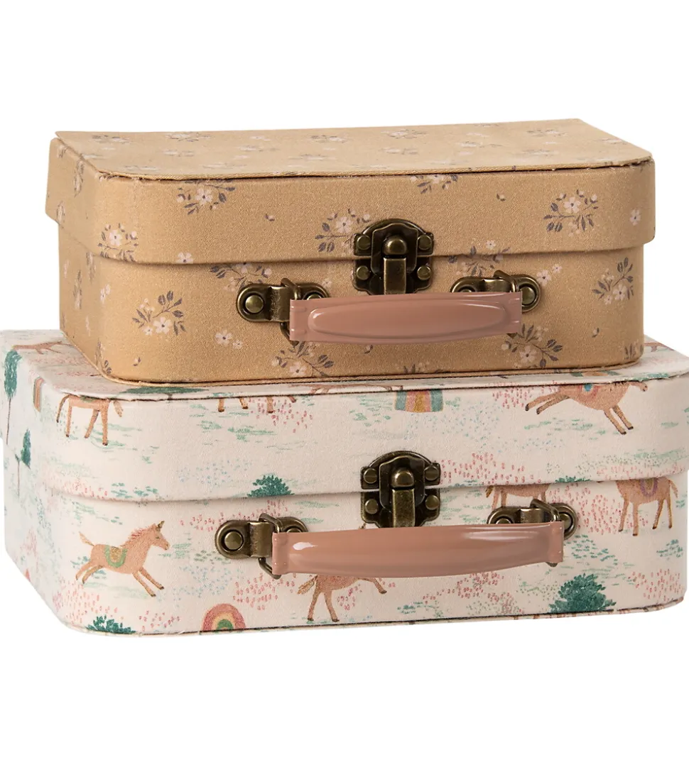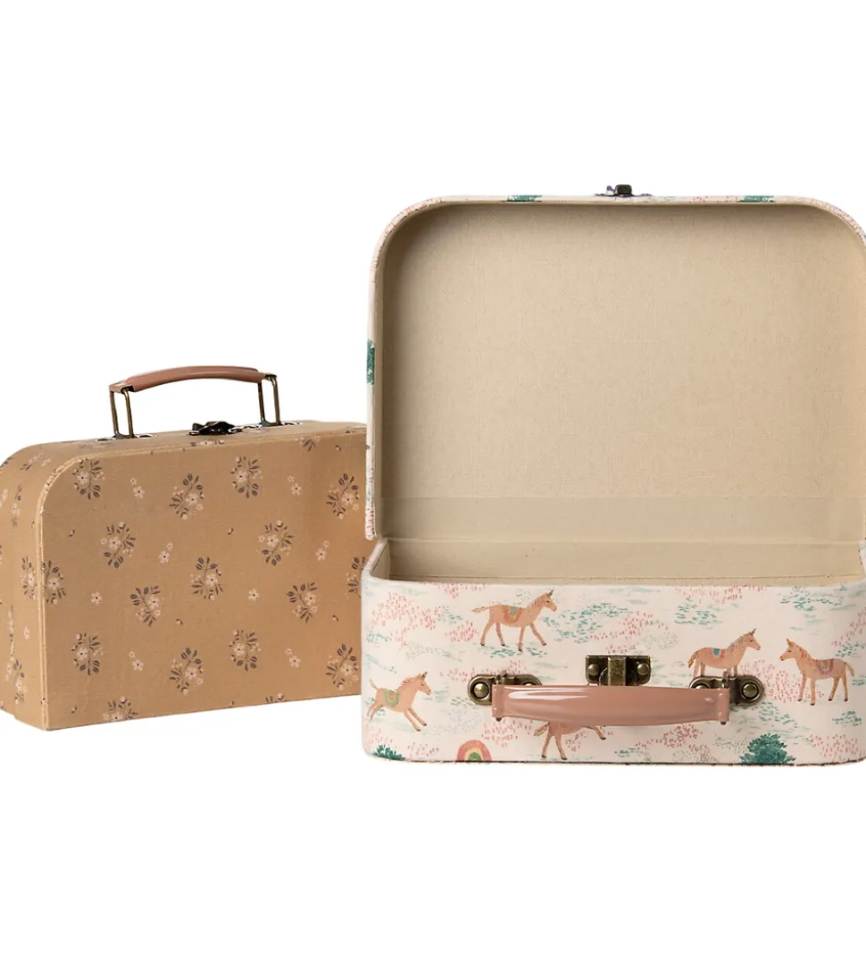 Elegant Maileg kuffertsæt bestående af to, smukke kufferter beklædt i stof. Den ene kuffert kommer i en fin lysebrun med blomstermotiv, mens den anden er i beige med et skønt print af heste. Perfekt til opbevaring af legetøj.