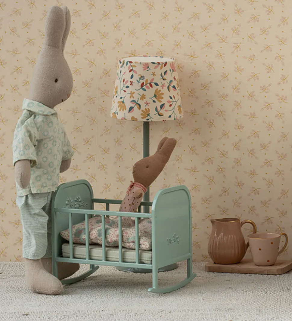 Fin Maileg vugge i mintblålakeret metal med en blød, mintblåstribet madras samt en sovepose i et blomstret design.