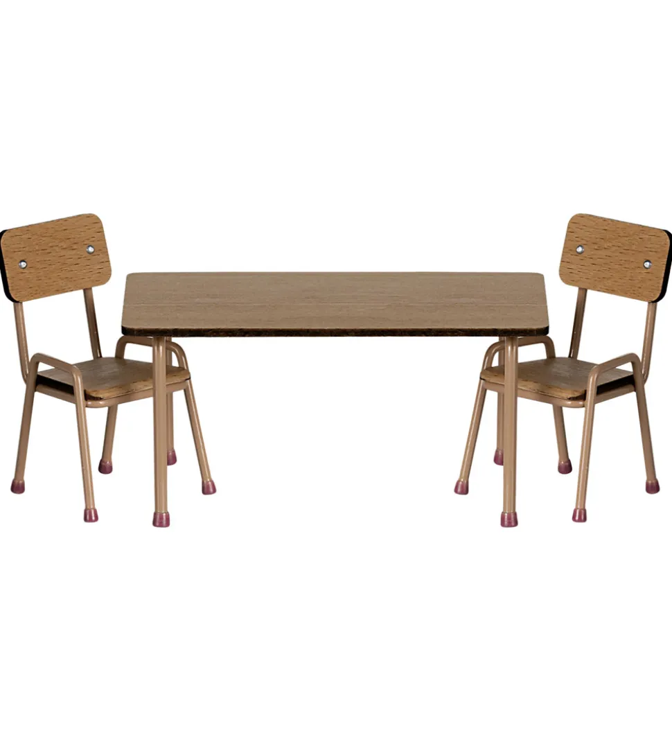 Fint Maileg dukkemøbel-sæt med et bord og to stole i et mørkt, pudderrosa farvetema. Dukkemøbel-sættet er i træ og metal.