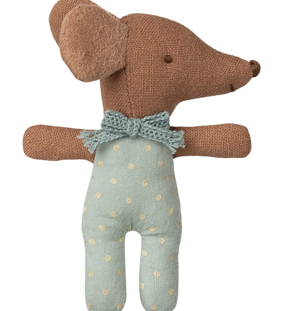 Charmerende Maileg mus i form af en babymus i brun iført en lyseblå natdragt med beige prikker. Musen leveres i en unik tændstikæske med dyne og pude, hvilket gør den til en hyggelig tilføjelse.