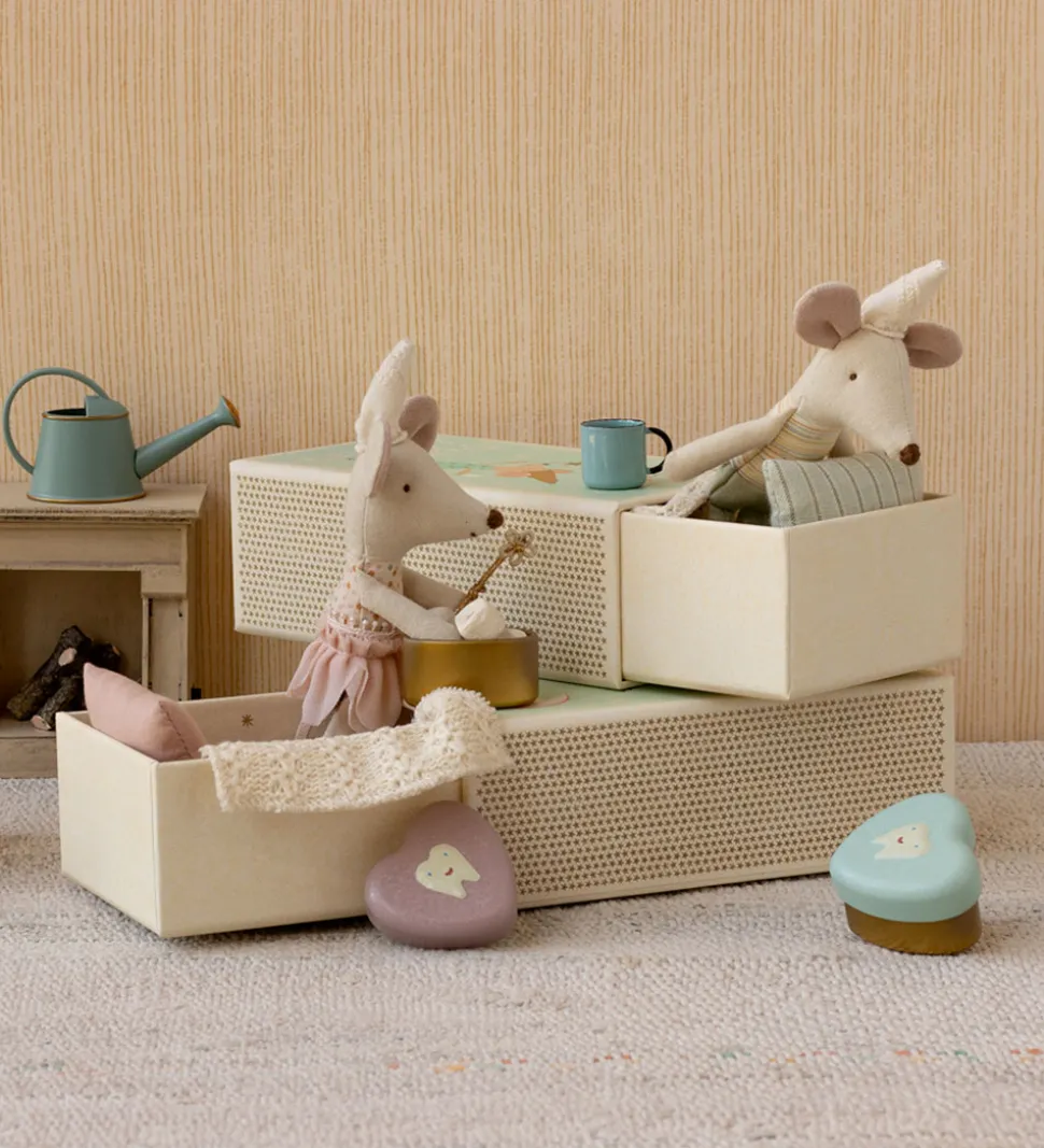 Musen leveres i en flot tændstikæske med dyne, pude og tæppe samt en tandæske, der fuldender det søde eventyrunivers med tandfe-tema. En lille ven med stor personlighed.