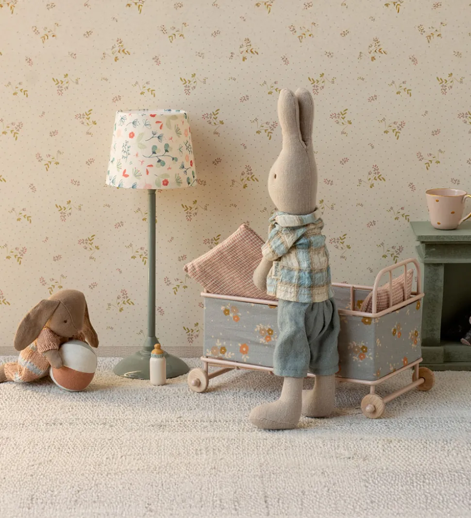 Maileg tremmeseng passer til Mailegs legetøj i størrelse mikro og gør familielegen komplet. Tremmesengen er på hjul og kommer med en gul dyne og en blød madras og pude i flotte, rosa mønstre.