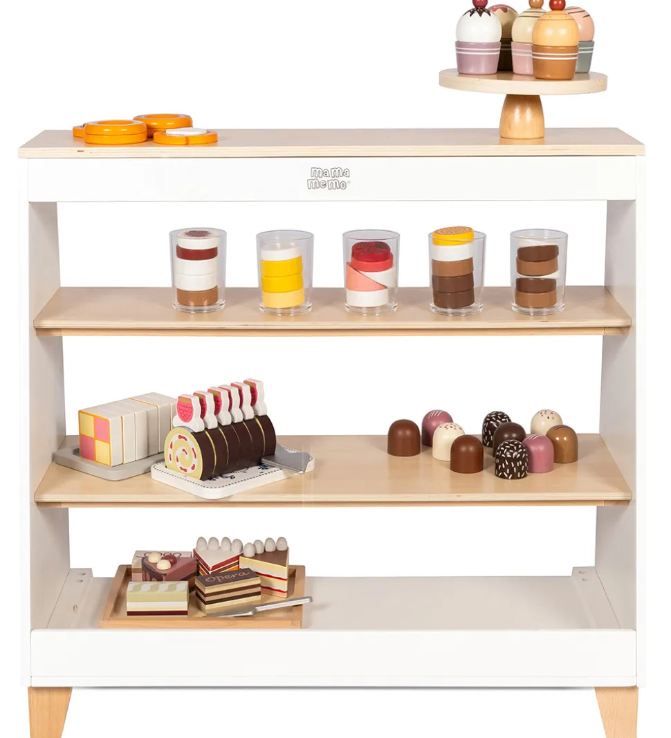 MaMaMeMo butiksdisken har en firkantet facon med i alt fire hylder med plads til forskellige varer fra f.eks. en købmand eller en bager. Butikdisken giver barnet mulighed for at lave sin egen butik, hvor man kan komme og købe forskellige varer, og det er med til at udvikle barnets fantasi og evne til indlevelse i rolleleg.