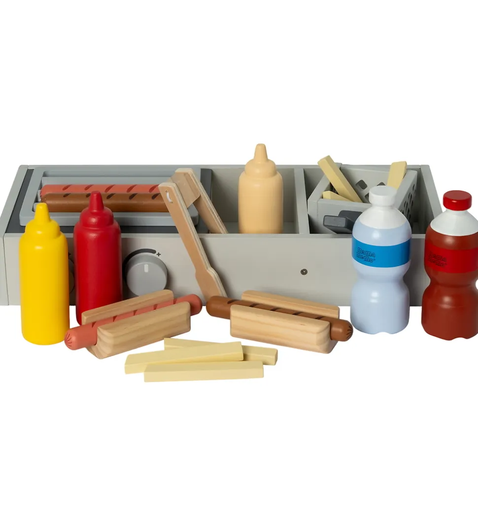 Farverigt MaMaMeMo legemad der forestiller en pølsebod med friture og en pølsesteger, og inkluderer 4 pølser, to pølsebrød, pommes frites samt forskellige tilbehørsdele. Legen bliver endnu sjovere med MaMaMeMo legemad.