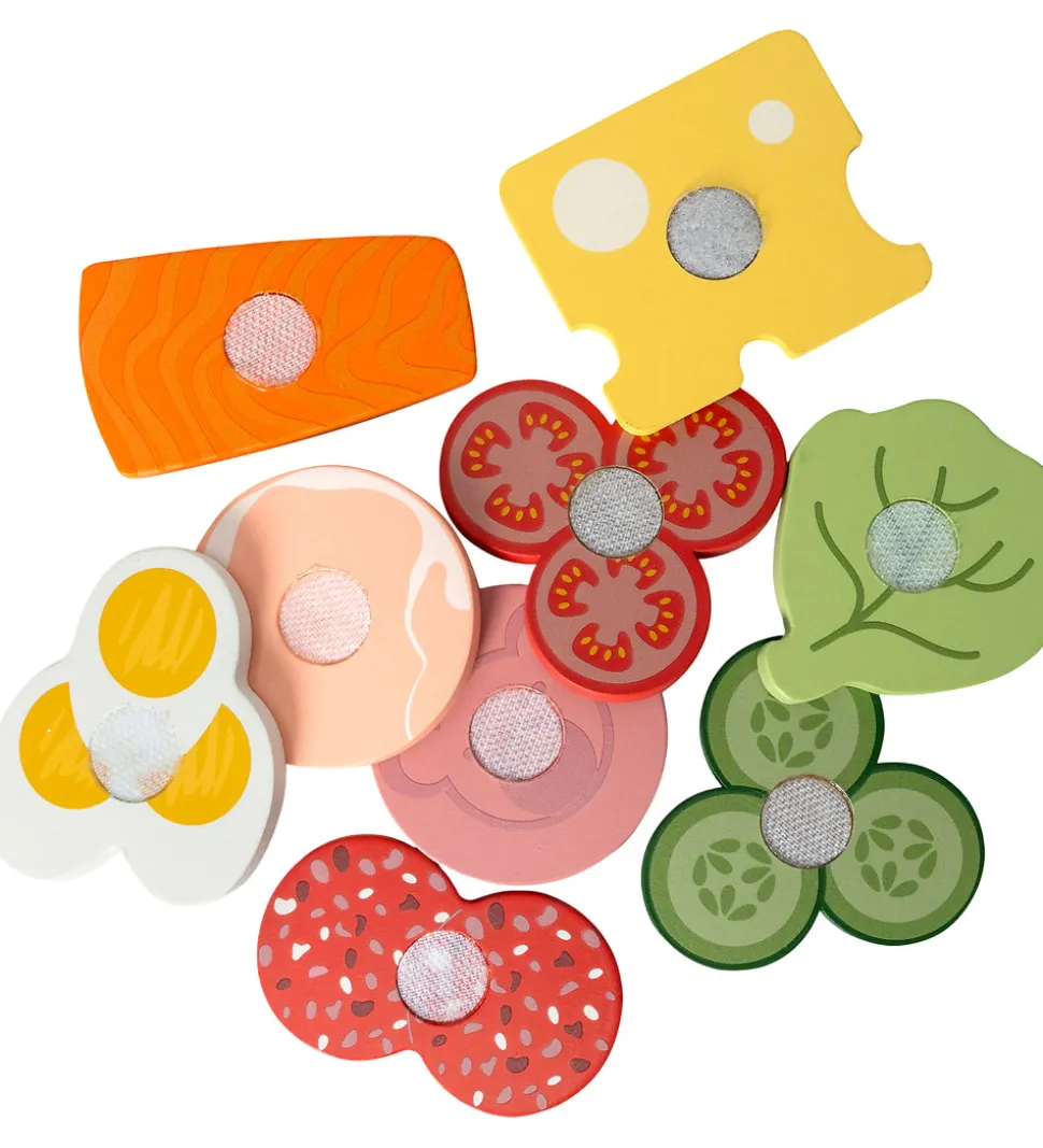 Fantasifuldt MaMaMeMo legemad bestående af to sandwich med fyld. MaMaMeMo legemaden er i malet træ, og det kan adskilles i forskellige dele, så man selv har mulighed for at bygge sin egen sandwich.