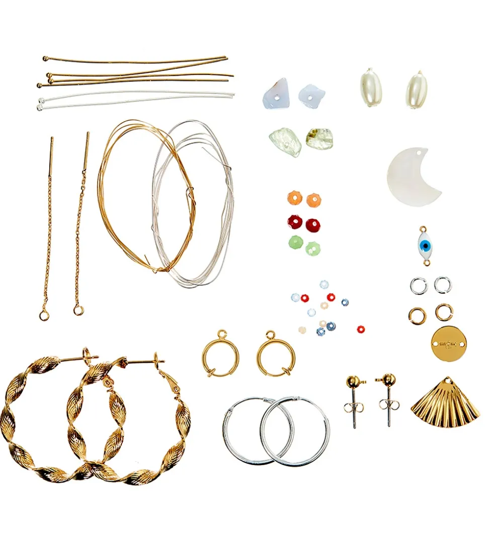 - Materialer: Hoops, ørestikker, ørekæder, øskner, perlestave, smykketråd