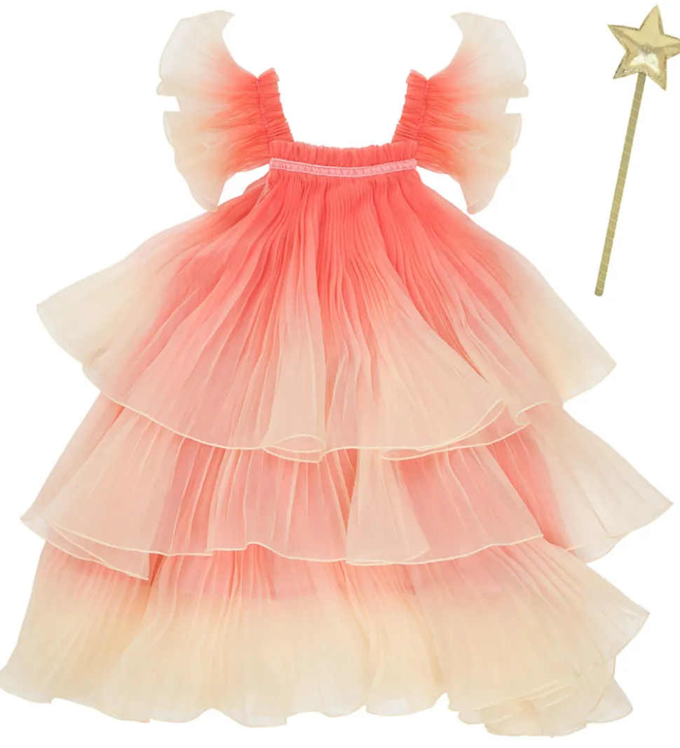 Meri Meri kjolen har brede flæseskuldre, den skørt falder i tre lag, der giver en smuk effekt. På ryggen er der flotte vinger, der har en strop til håndleddene, så den lille fe, kan brede sine vinger ud.