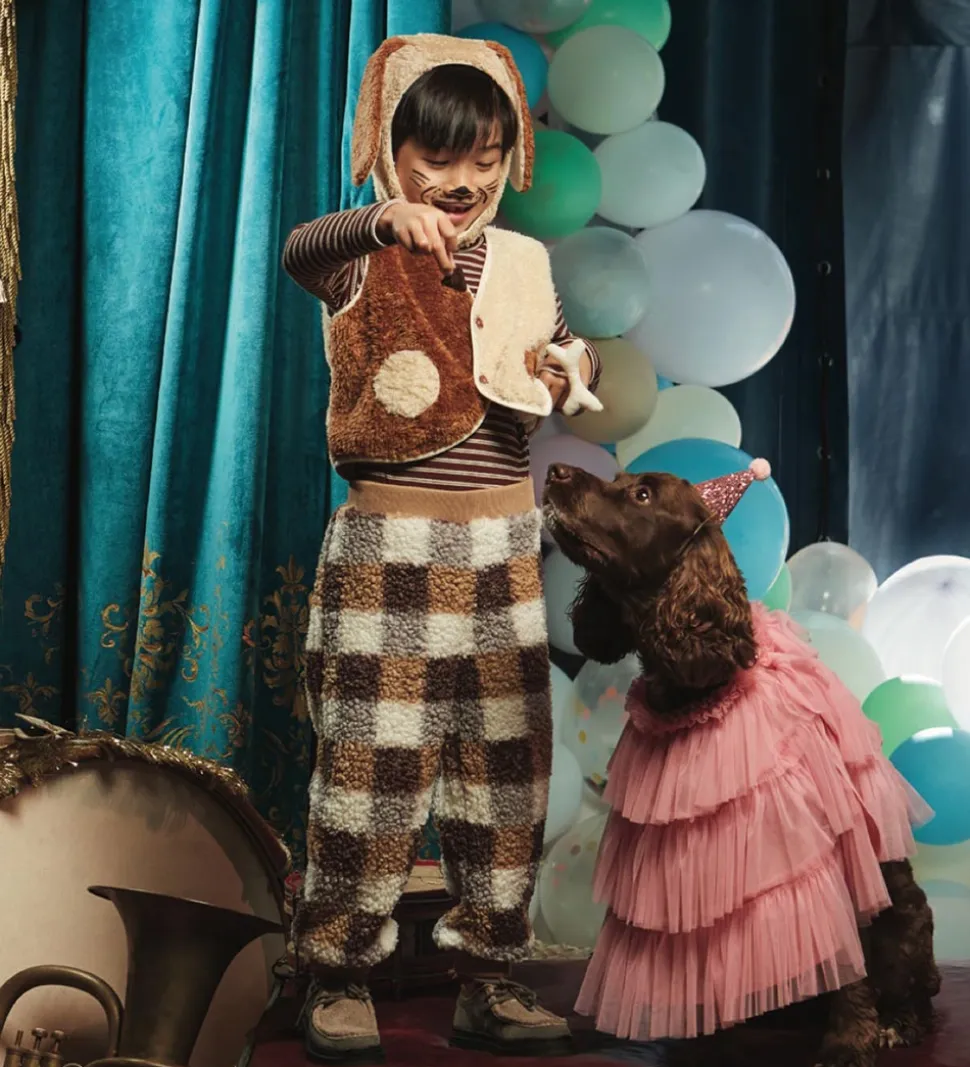 Meri Meri udklædningen er af teddyfleece og består af en vest med knaplukning, lommer og et “kødben”-vedhæng og en hat med lange hundeører og velcrolukning under hagen.
