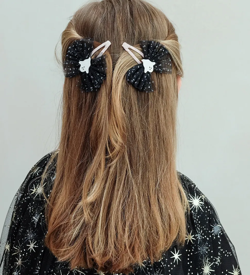 Seje Mimi & Lula hårklips solgt i en 2-pak i rosa med et glimmerspøgelser samt en stor, sort tylsløjfe med sølvglimmer.
