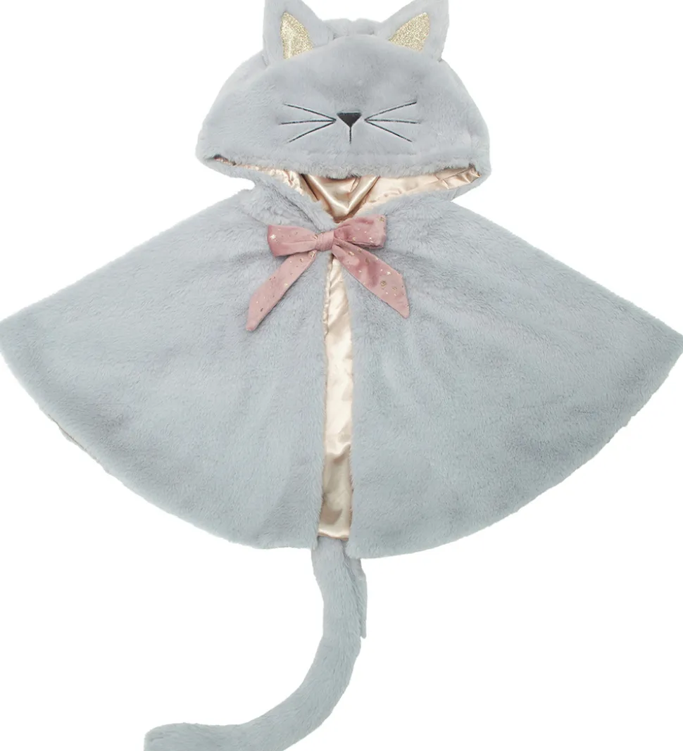 Sød Mimi & Lula kappe i grå plys med katte øre på hætten, samt et fint lille katte ansigt og en flot rosa sløjfe.