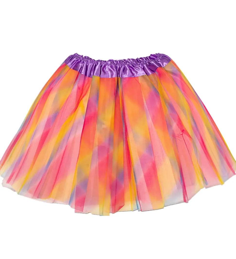 Farverig Molly & Rose tylskørt i et levende regnbueprint med lilla elastik i taljen. Perfekt til fantasifuld leg og kreativ udfoldelse. En iøjnefaldende tilføjelse til udklædningen, der bringer glæde og farver til dagen.