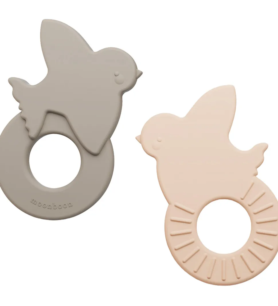 Praktiske Moonboon bideringe solgt i en 2-pak i en flot lys rosa og gråbrun nuance. Bideringene har form som en fugl på toppen.