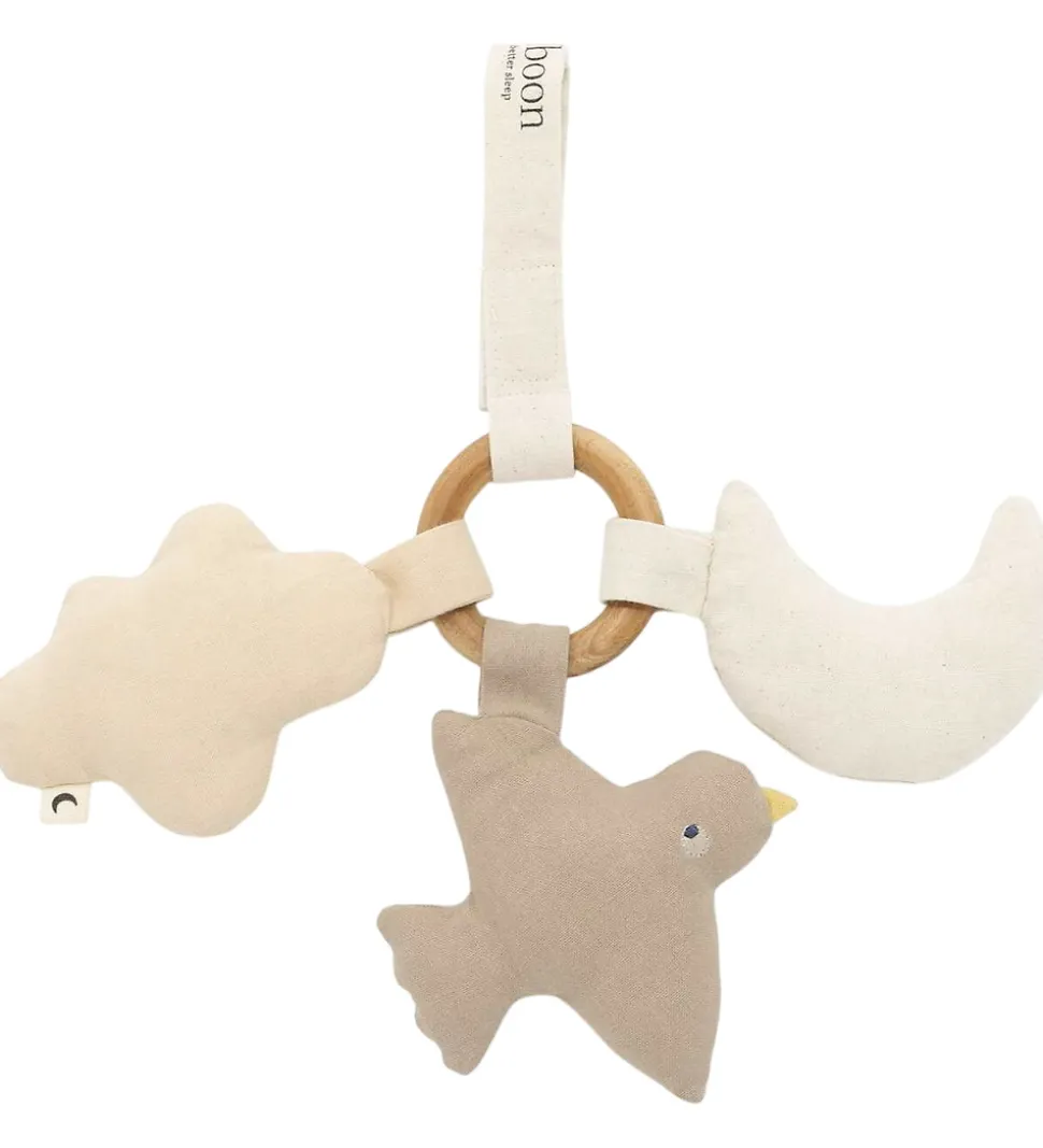 Charmerende Moonboon ophæng der består af tre bamser formet som en sky, fugl og måne. Ophænget har bløde former og stimulerer barnets udvikling og sanser.