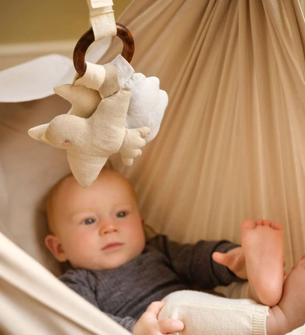 Ophænget har en praktisk velcrostrop i toppen, der gør den er let at hænge på tremmesengen, aktivitetsstativet eller barnevognen.