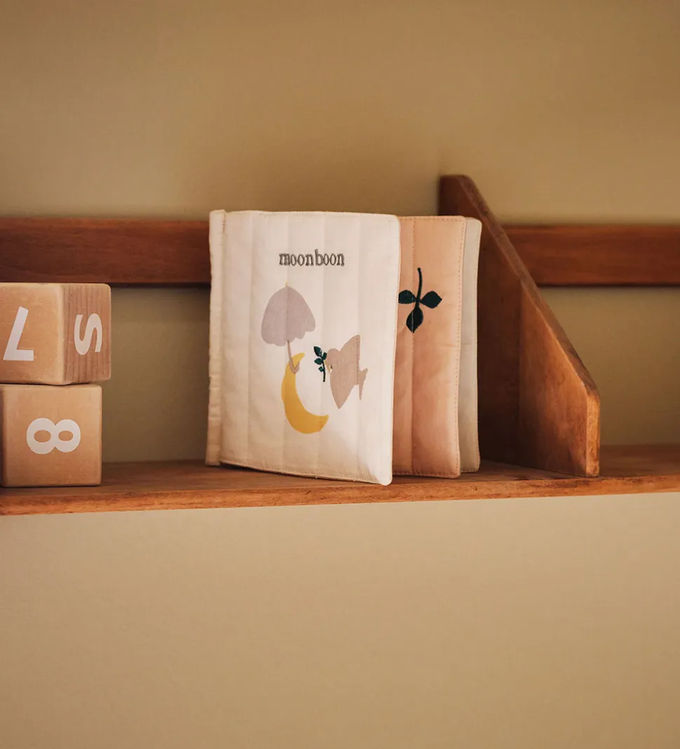 Fin Moonboon stofbog i råhvid med fine fugle- og naturprint med broderede detaljer. Stofbogen har en påsyet fugl, sky og måne, som barnet kan sanse og lege med.