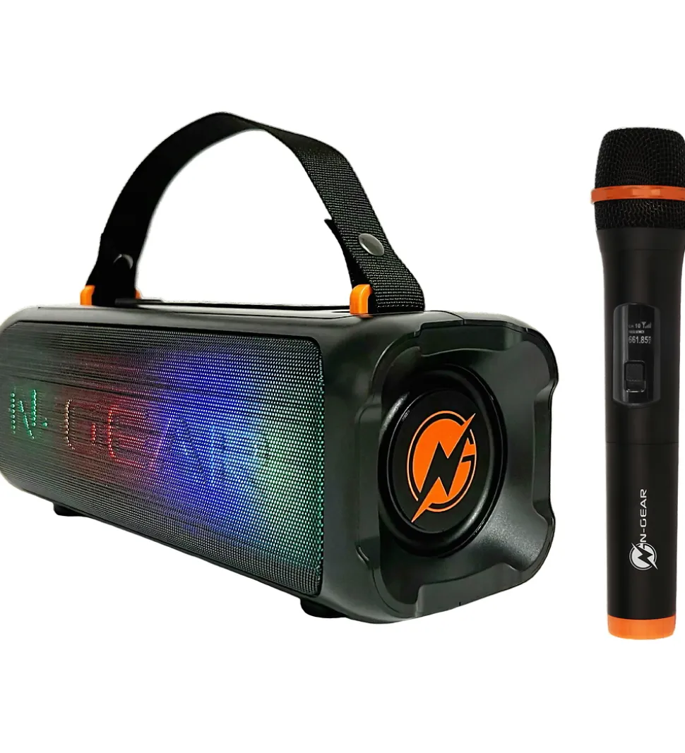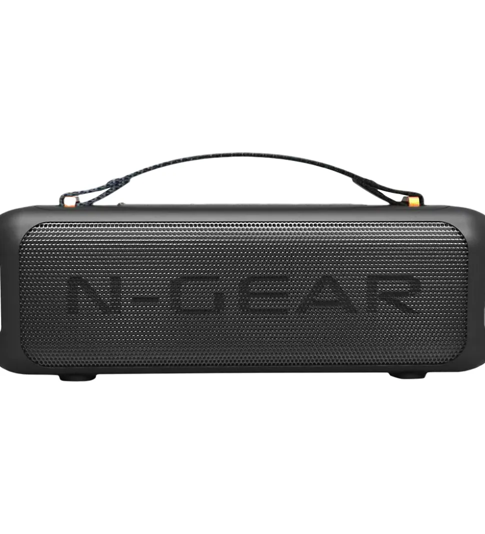 N-GEAR højtaleren er trådløs, og den fylder ikke meget, så den er nem at have med på farten. Højtaleren har et genopladeligt litium-batteri, som tilsluttes et USB-C-stik som medfølger, og den har en kapacitet på 100 W. Når Højtaleren er opladet, kan den spille i op til 5 timer. Der medfølger en trådløs mikrofon, så man kan synge med på de sange, den afspiller, og fortil er der et lyspanel, som kan lyse op i alle regnbuens farver. I toppen sidder der en rem, som kan bruges som håndtag, når man bærer rundt på højtaleren.