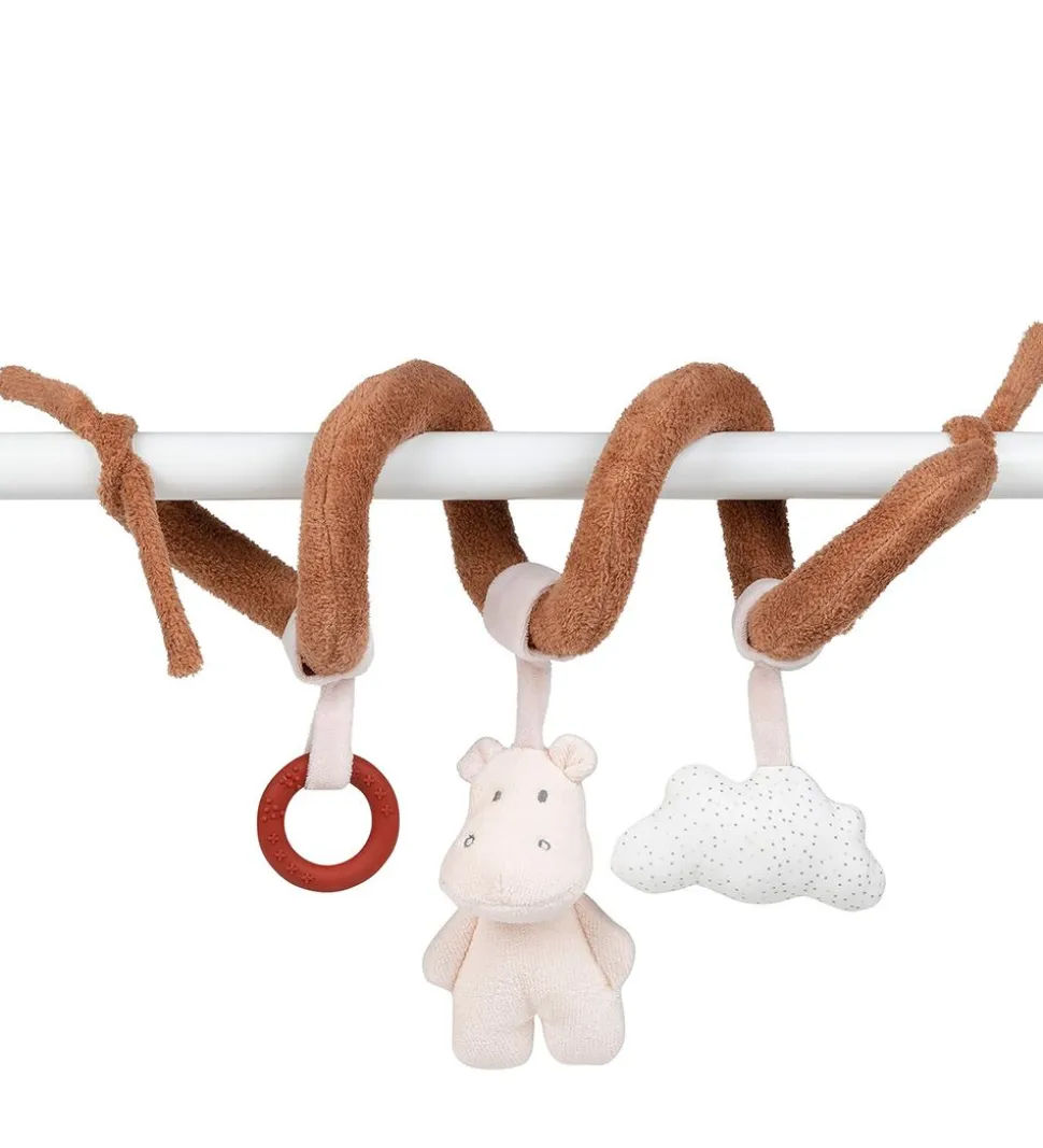 Nattou aktivitetslegetøjet er i en dejlig blød kvalitet og er formet som en spiral, som kan strækkes så den er let at hænge op lige hvor der er brug for underholdning. Den rosa flodhest og den hvide sky er begge rangler, og bideringen har forskellige strukturer til at lindre kløende gummer.
