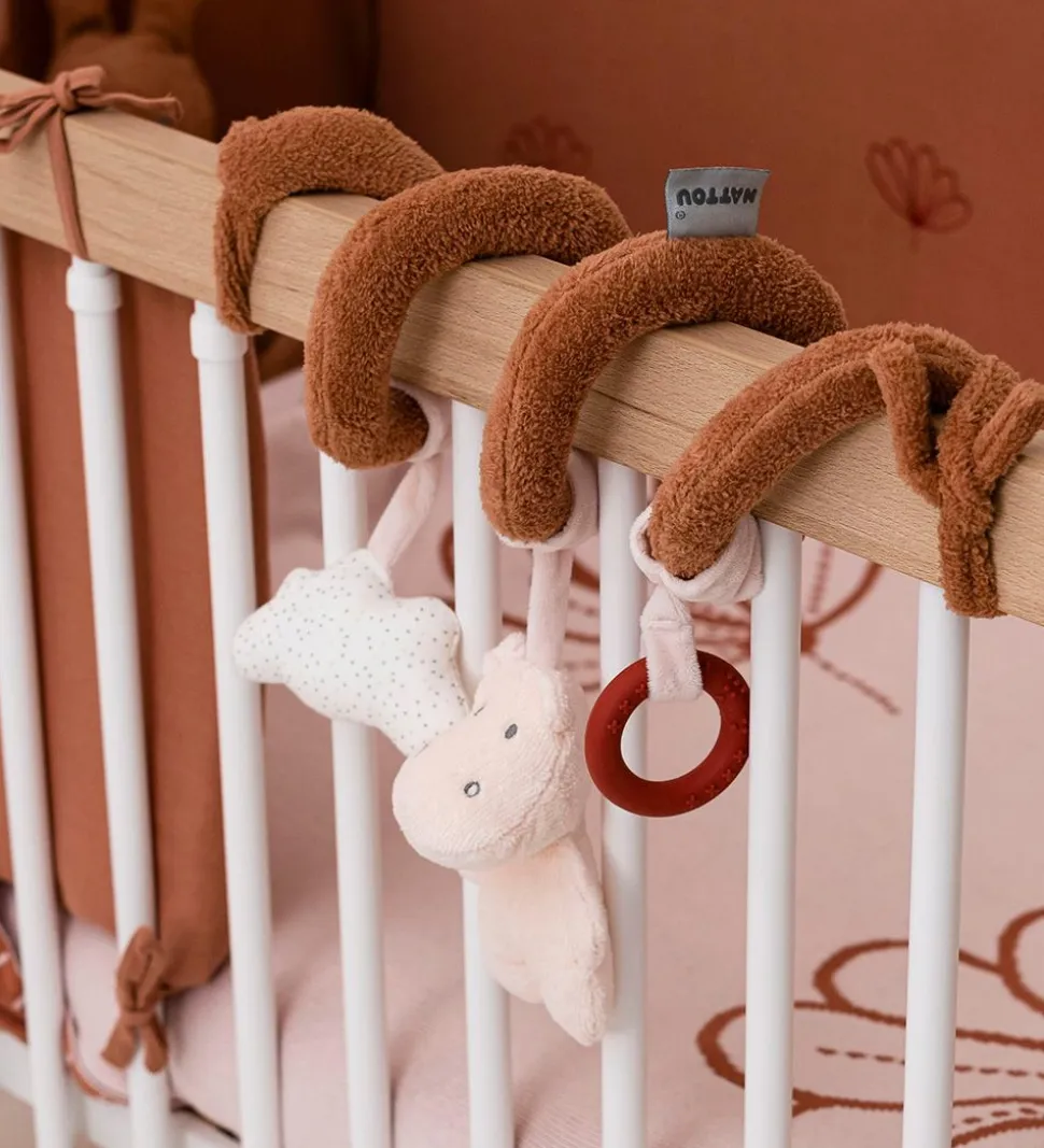 Godt Nattou aktivitetslegetøj i brun plys, med tre vedhæng under bunden af en rosa flodhest, en rød bidering og en hvid sky.