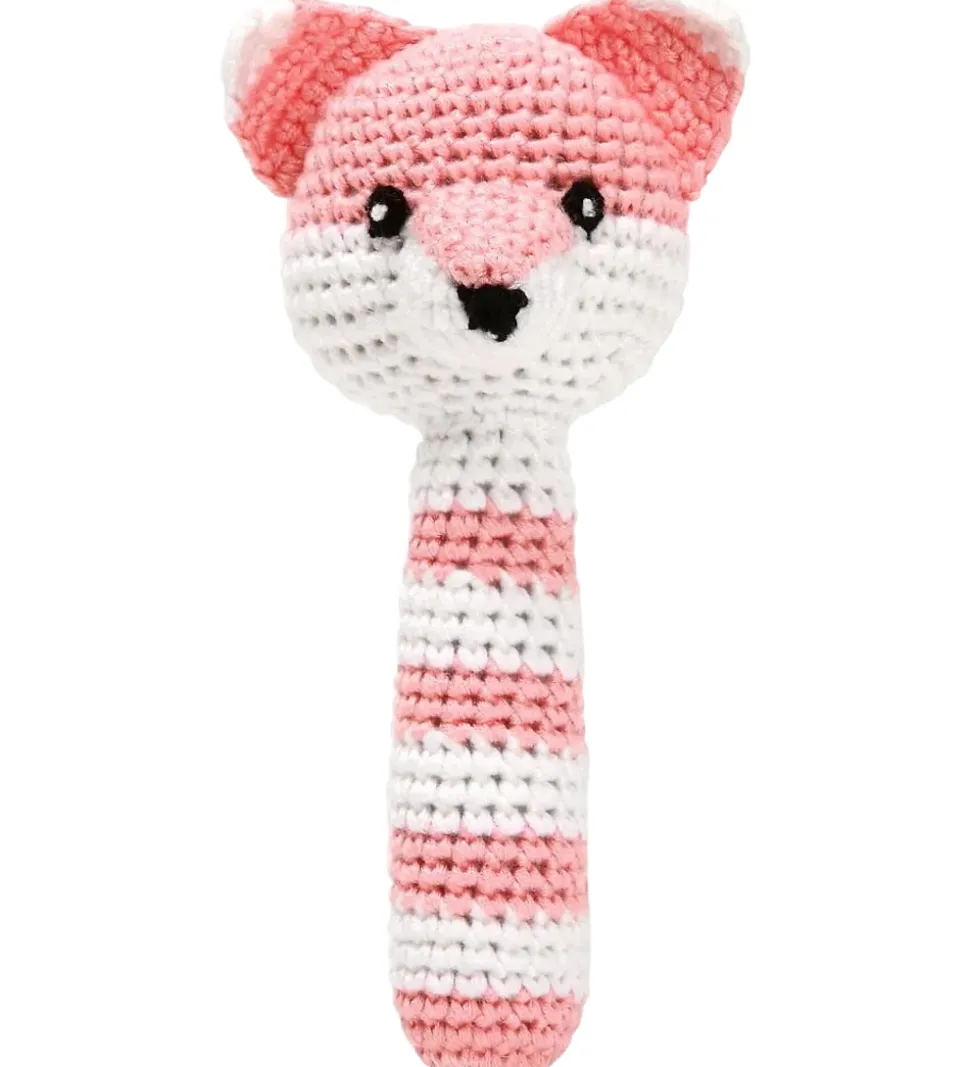 Charmerende NatureZoo rangle udformet som en ræv i bløde nuancer af lyserød og hvid. Ranglen er håndhæklet og har et stribemønster langs skaftet, hvilket giver den et sødt udtryk.