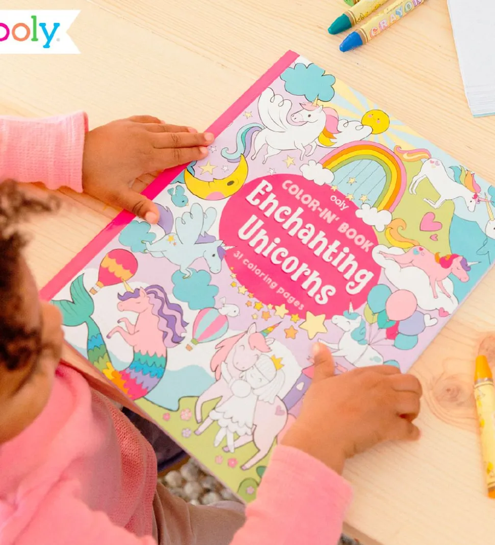 Sød Ooly malebog med enhjørninger, som ender med at blive et farverigt kunstværk.