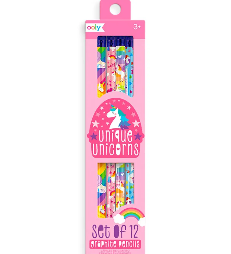 Flot Ooly sæt bestående af et stort viskelæder, som forestiller en regnbue samt 12 blyanter med enhjørninger og en sort blyantspidser.
