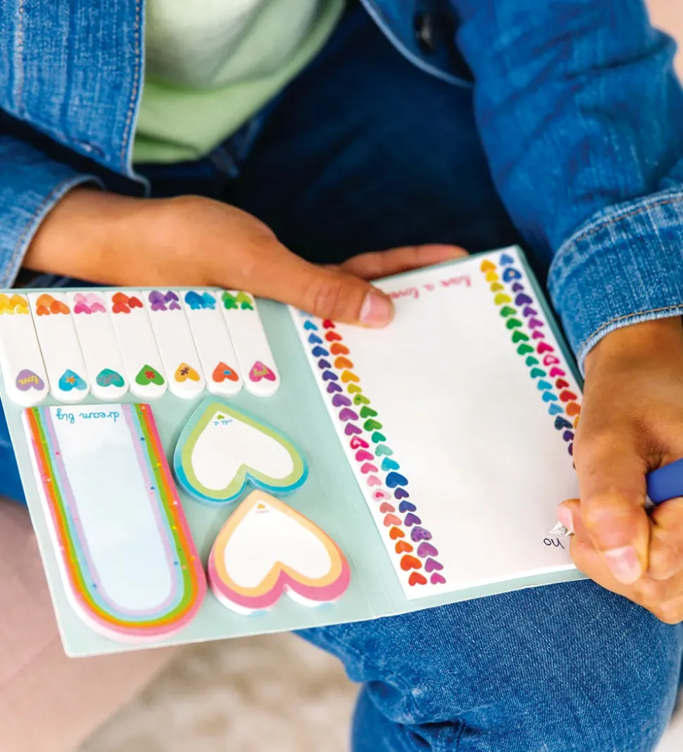 Farverig Ooly Notesbog i en sjov kombination af hjerter i forskellige nuancer. Denne notesbog er perfekt til kreative idéer og sjove beskeder med sine farverige detaljer og praktiske sticky faner.