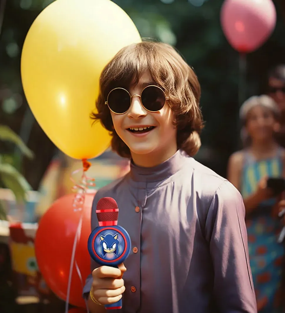 Sej, trådløs OTL mikrofon i et blåt og rødt Sonic The Hedgehog-tema med Sonic.