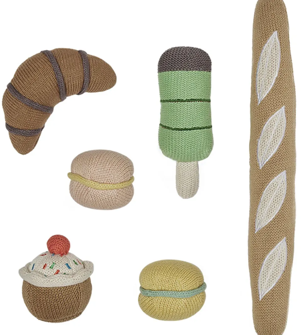 Hyggeligt OYOY legemad med en strikket struktur, bestående af en baguette, croissant, is, cupcake og macarons.