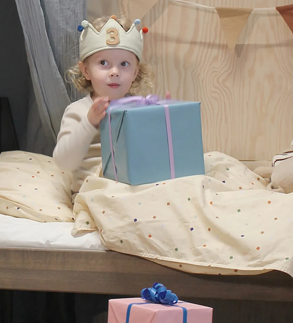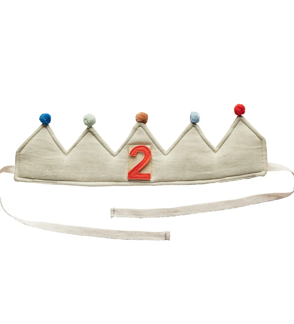 OYOY kronen bindes om hovedet med smalle, hvide bindebånd. Fortil er der en velcrofirkant, og der medfølger tallene 1-9 i lyseblå, mørkeblå, orange og brun, som kan sættes fast på kronen. Fødselsdagskronen er vatteret, og den er en flot udklædning til fødselsdagsbarnet.