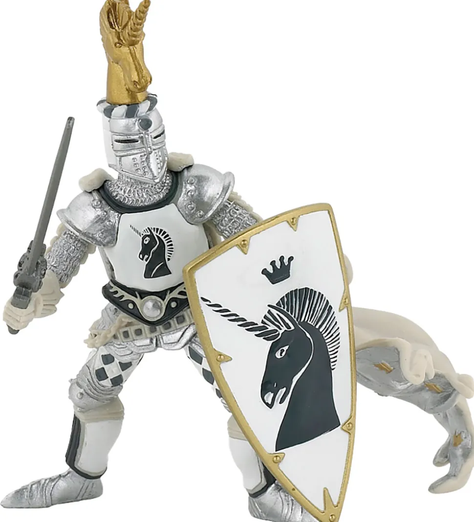 Flot Papo ridder i form af en våbenmester med kappe og udrustning i hvid, guld sølv og sort med enhjørningedetaljer. Ridderen er kampklar med sit sværd og sit skjold i hænderne.